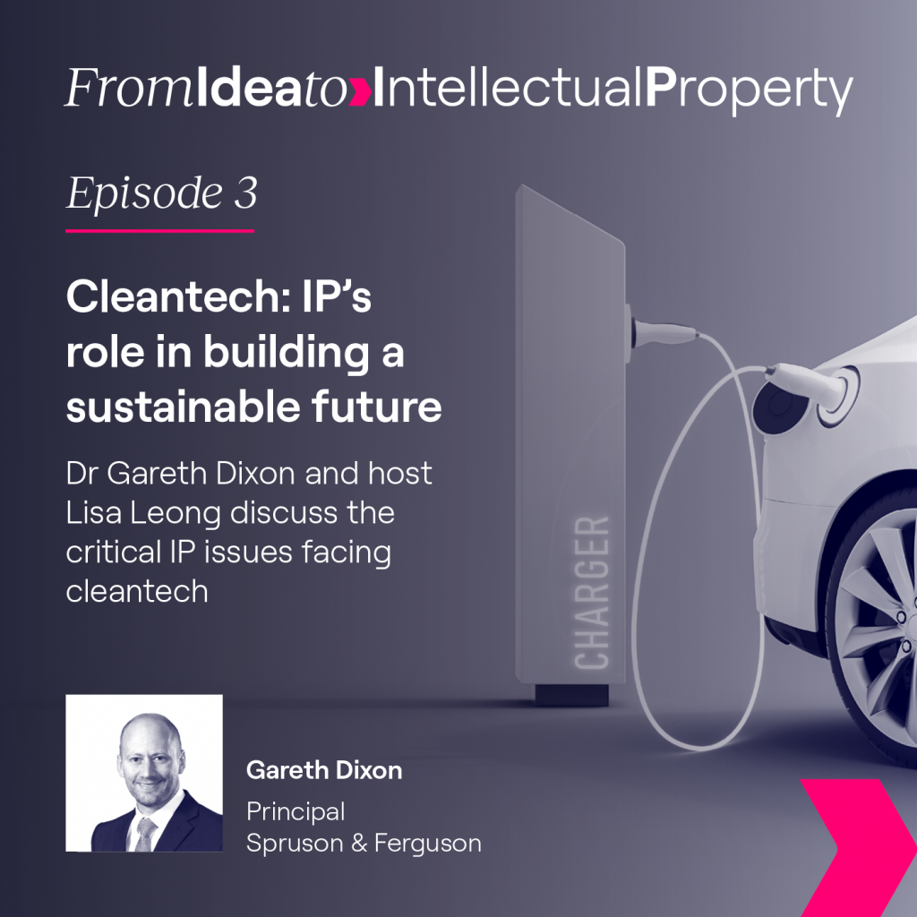 In the latest episode of From Idea to Intellectual Property, Spruson & Ferguson Principal Dr Gareth Dixon discusses how patents can be used to “exploit” beneficial technologies related to cleantech, where the number of patents being applied for and granted is increasing exponentially. Finding the fastest route to commercialisation is a key talking point – providing a deeper dive into how to maximise the return on investment.