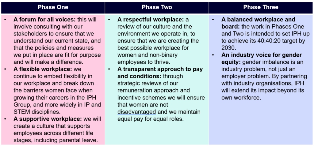 At IPH, we are committed to driving positive change and have adopted a 40:40:20 approach to workforce composition. By 2030 we aim to achieve 40% women, 40% men and 20% of any gender, with a specific focus on senior leadership roles.